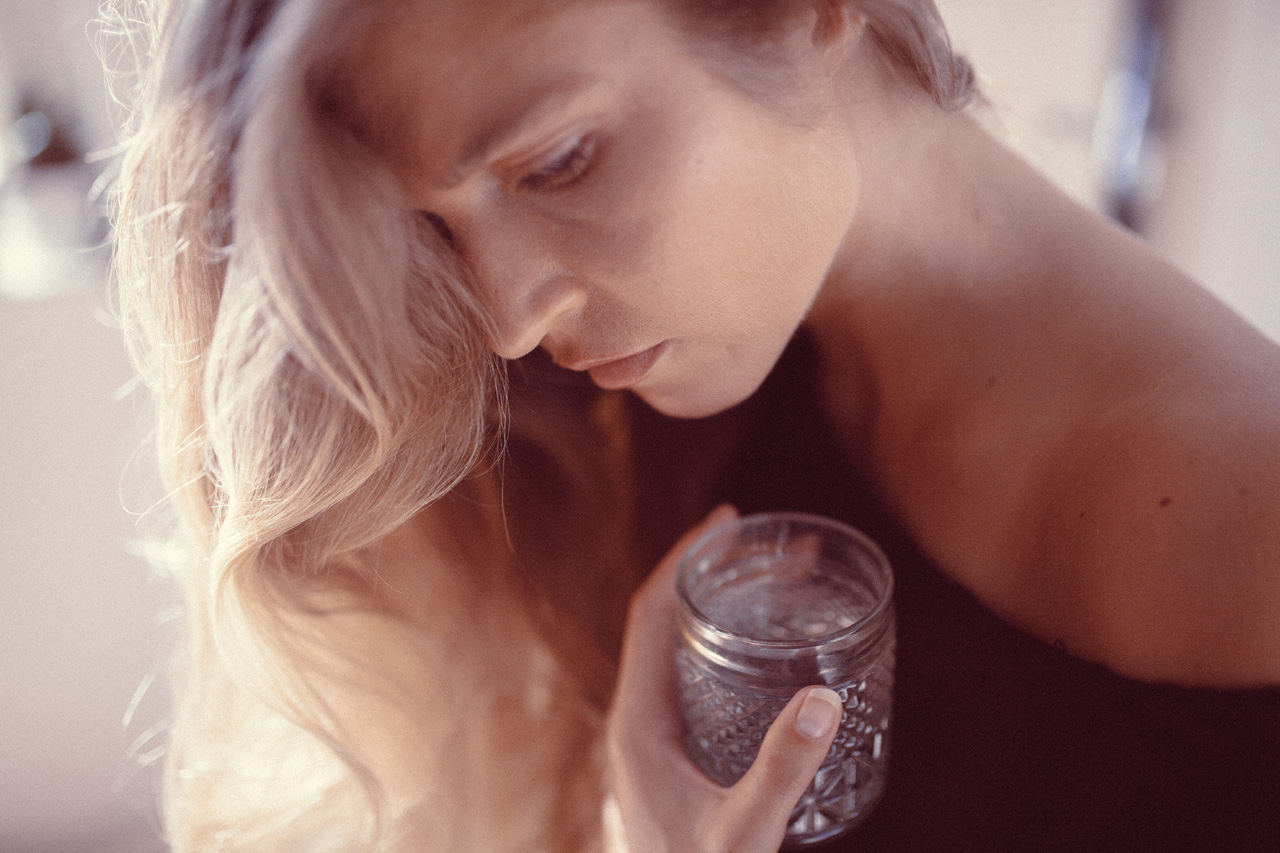 Wir unterhalten uns, im Hintergrund läuft leise José Gonzalez und Annemarie lässt die Hüllen fallen. Durch die geöffnete Balkontür strömt die warme Sommerluft in die helle Küche. Ganz ungezwungen, fast wie selbstverständlich lehnt Annemarie an der Arbeitsplatte, das Glas Wasser in der Hand. Ich begleite das Geschehen still und versuche beim Fotografieren zu sehen, was im Kopf von Annemarie vorgeht. Es fühlt sich an, wie der Morgen nach einem guten Abend mit ein paar Wein. Gerade ist sie frisch aus dem Bett geklettert, um den schalen Geschmack auf der Zunge mit einem Glas Wasser herunterzuspülen und die trockenen Lippen zu benetzen. In Gedanken geht sie den vergangenen Abend durch. Die Musik. Die Getränke. Die Begegnungen. Die Nacht.