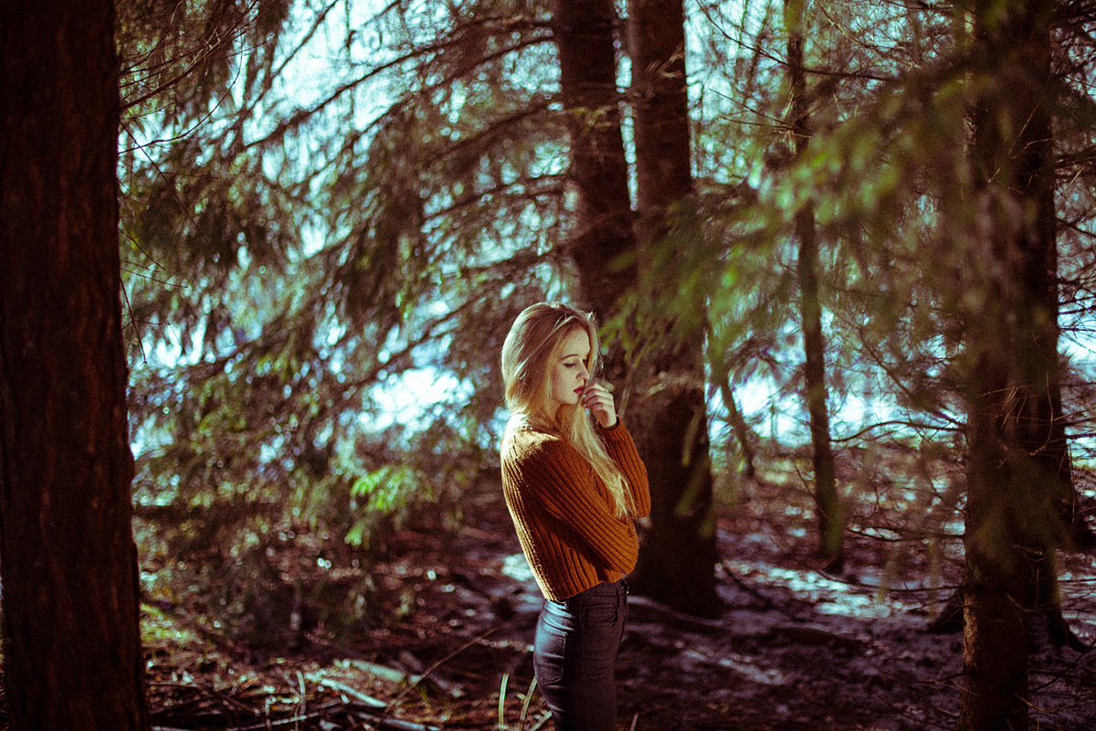 Das erste Shooting führt uns in den Wald. Nach einigen Umwegen und nervenzehrender Parkplatzsuche, haben wir den Ort der Wahl gefunden. Claudia sieht sich um, ich mache meine Kamera im Schatten der Bäume bereit. Als der schwarze Mantel von den Schultern gleitet und der orangene Pullover seinen Kontrast zum Grün des Waldes und zum Blau des Himmels preisgibt, bleibt mir nichts anderes als Begeisterung. Danke, Claudia.